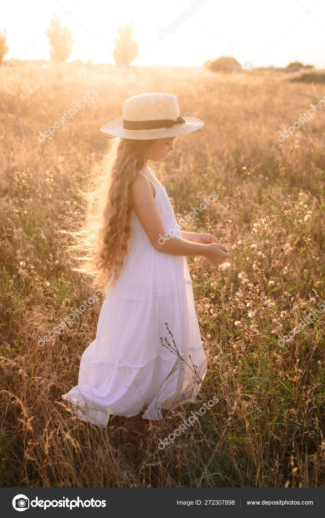 Cute Little Girl Blond Long Hair Summer Field Sunset White Stock