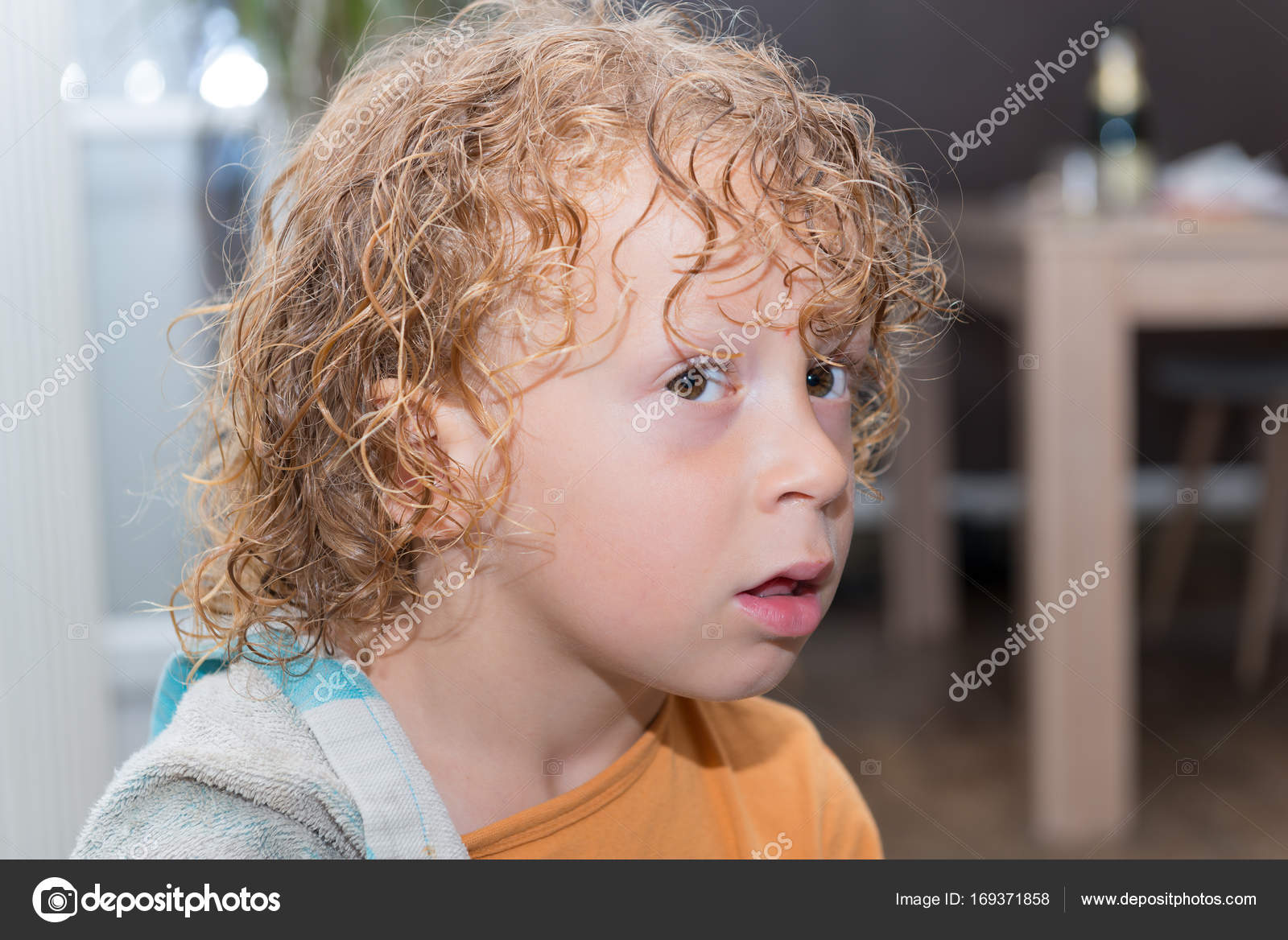 Portrait Of Little Boy With Blond And Curly Hair Stock Photo
