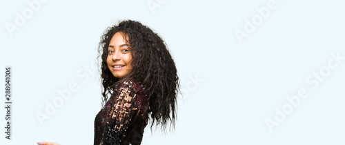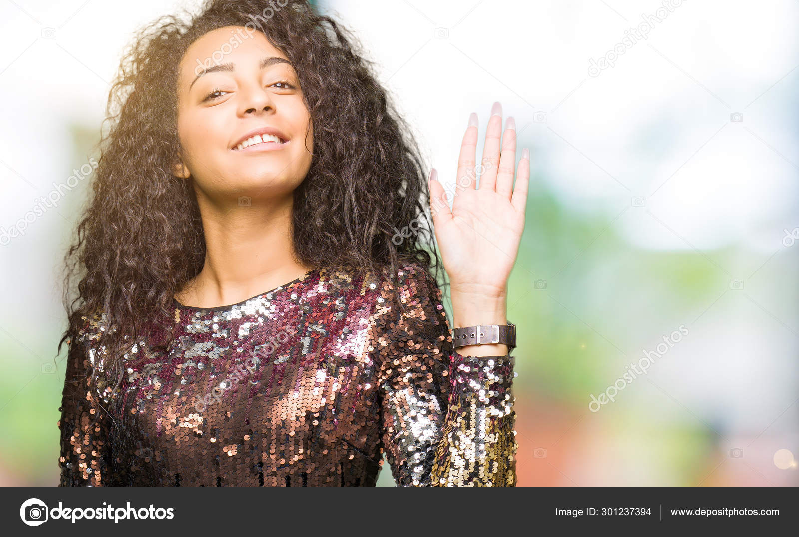 Young Beautiful Girl Curly Hair Wearing Night Party Dress Waiving