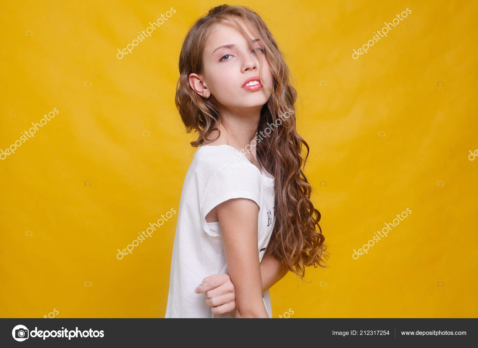 Joyful Girl Beautiful Brunette Hair Yellow Background Kid Style